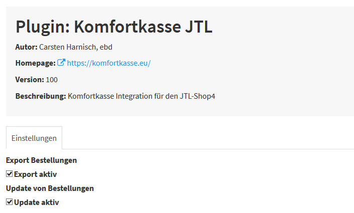 Wählen Sie "Export Bestellungen", um Bestellungen zu Komfortkasse zu übertragen und "Update von Bestellungen", um Updates zum Zahlungsstatus zu empfangen.