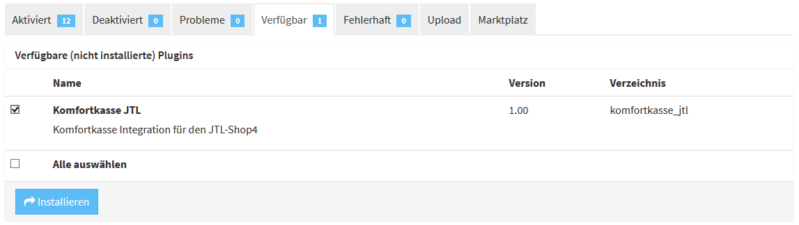 Wechseln Sie zur Registerkarte "Verfügbar", selektieren Sie das Komfortkasse Plugin und klicken Sie "Installieren".