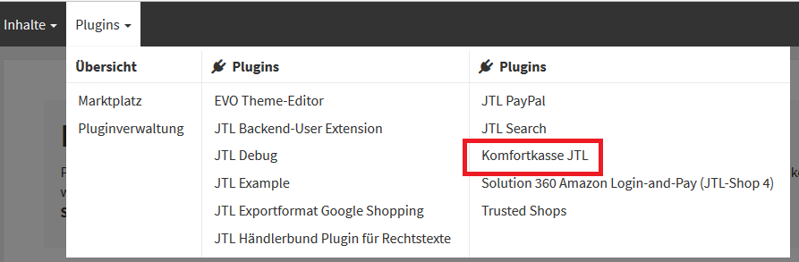Öffnen Sie die Konfiguration des Komfortkasse Plugins über Plugins - Komfortkasse.
