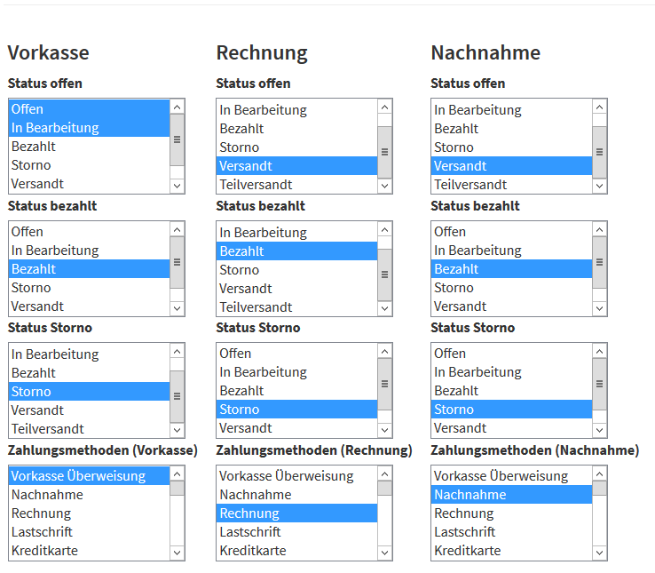Wählen Sie, welche Bestellstatus als "offen" gelten sollen, welcher Bestellstatus bei einer Zahlung gesetzt werden soll und welcher Status bei einer Stornierung gesetzt werden soll.