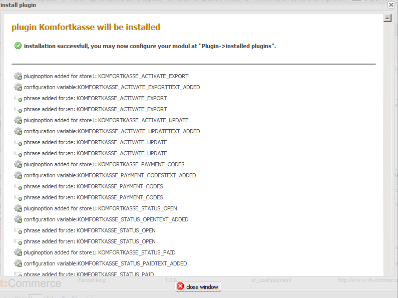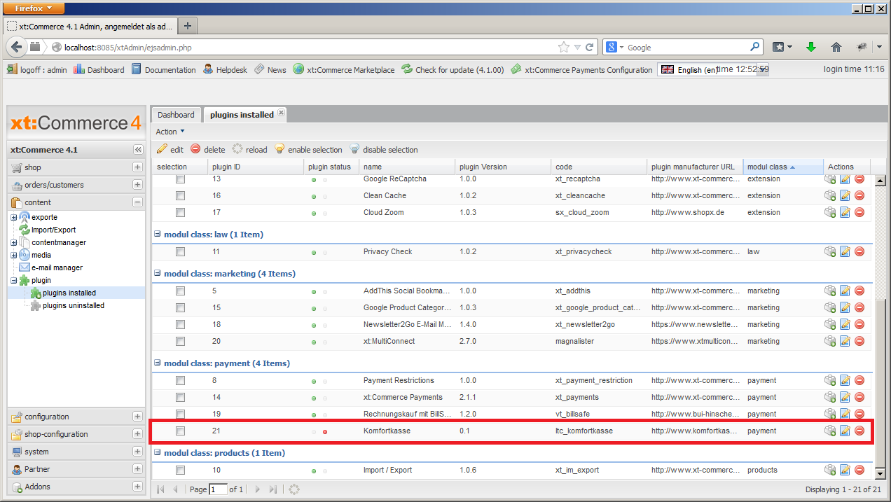 Gehen Sie nun zu „Content“ -> „Plugin“ -> „Plugin installed“. Sie sollten Komfortkasse unter der Modulklasse „payment“ sehen.