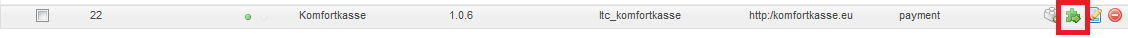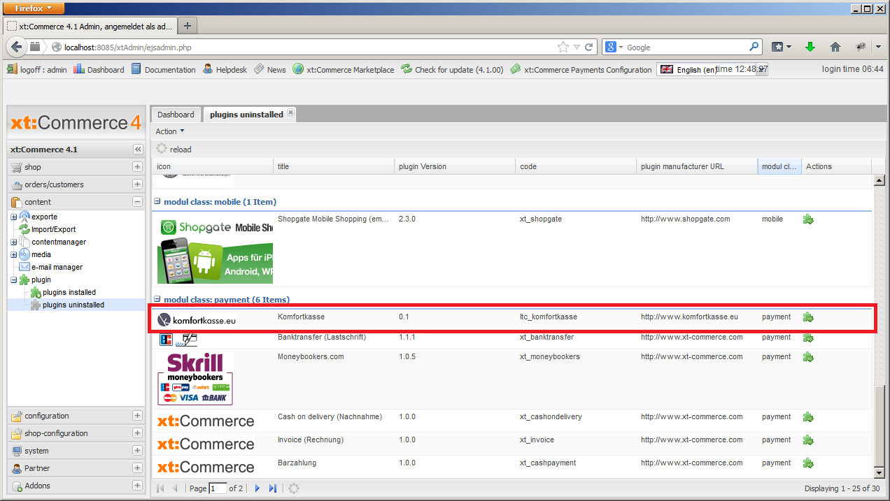 Melden Sie sich bei Ihrem xt:Commerce Admin an und gehen Sie zu „Plugin“ -> „“Plugin uninstalled“. Unter der Modulklasse „payment“ finden Sie Komfortkasse:
