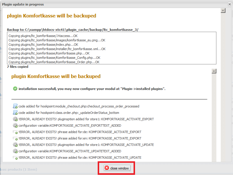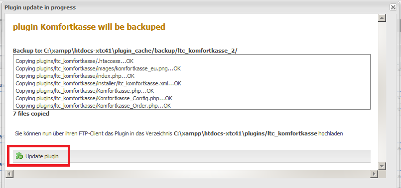 Kopieren Sie die neue Version in Ihren Ordner /plugins. Benennen Sie das vorhandene Plugin um, z. B. in /plugins/ltc_komfortkasse_OLD. Entpacken Sie die neue Version in /plugins/ltc_komfortkasse.
