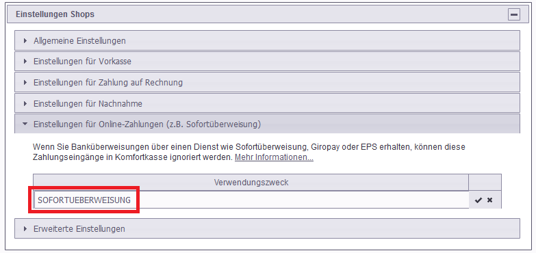 If you use Sofortüberweisung via a payment service provider, you may find the settings in the administration interface of the payment service provider. - Specify the same word in the Komfortkasse merchant area under Settings - Settings for online payments: